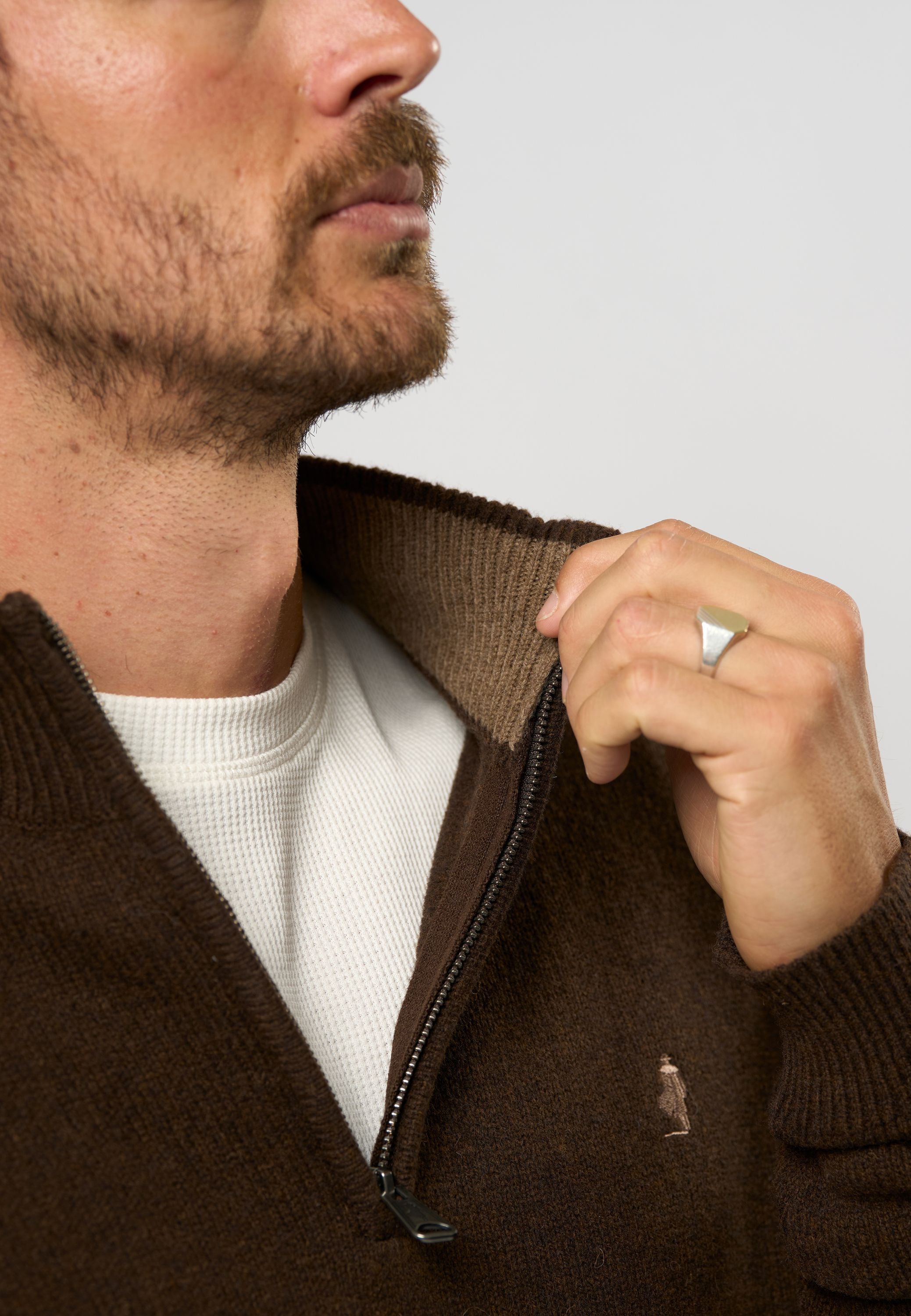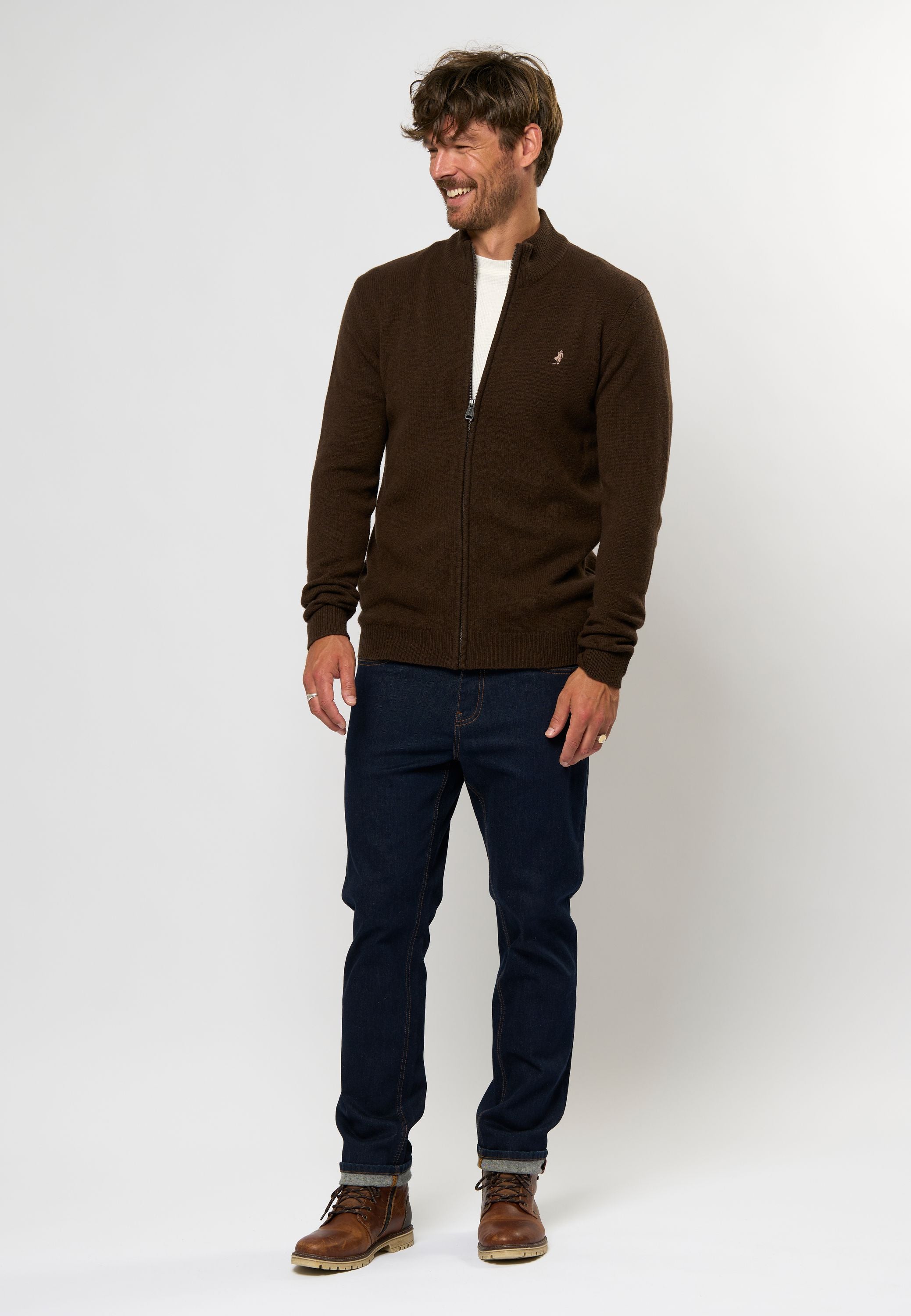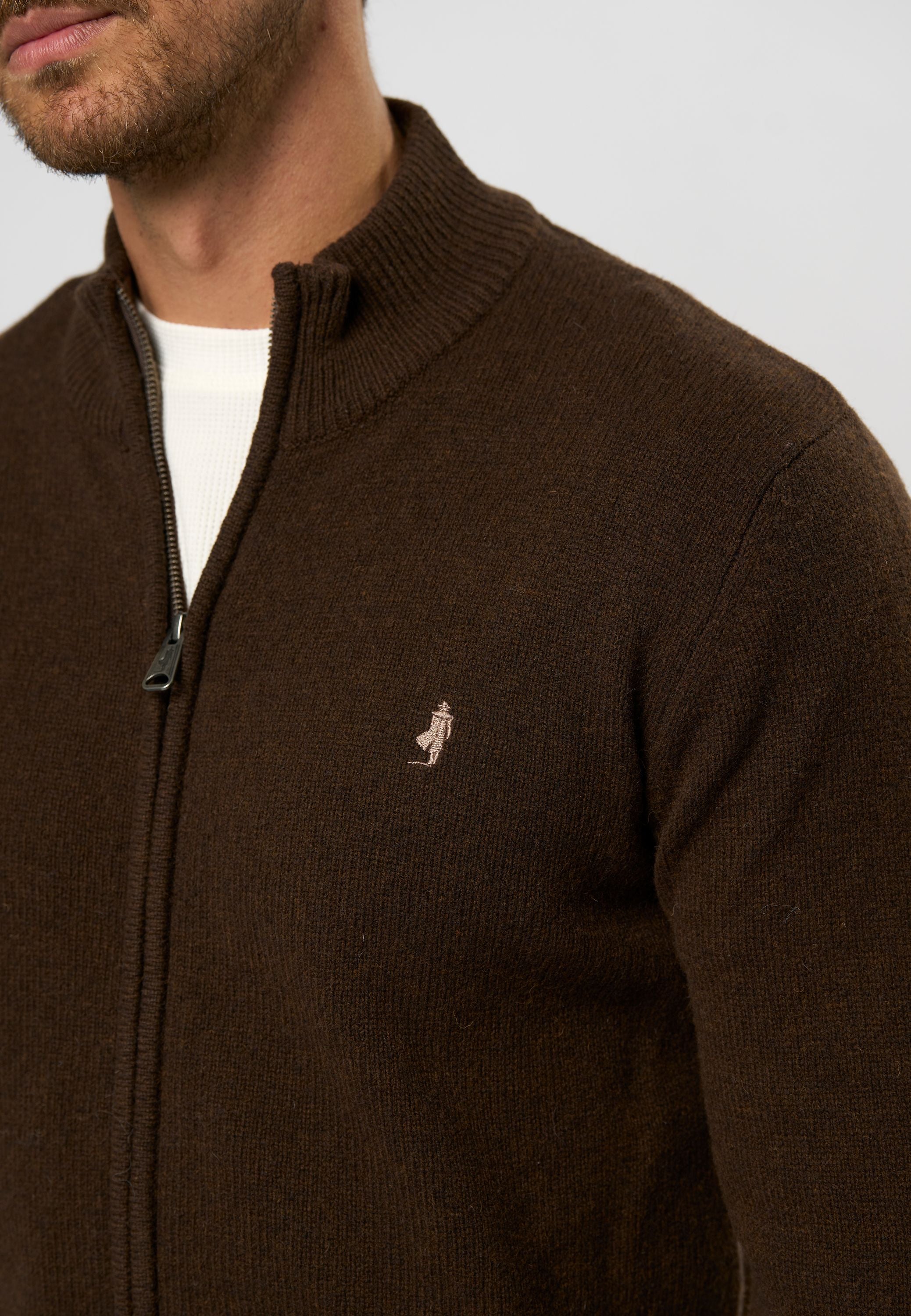 Alfie er en stilet strik med Full-zip lavet af lammeuld, og er derfor af lækker blød kvalitet. Lammeuldet hjælper dig med at holde temperaturen året rundt. Alfie er perfekt til hverdagsbrug og super cool sammen med et par jeans. Brug den med en enkel T-shirt under. Alfie er strækbar og har vores Rider-logo broderet på brystet